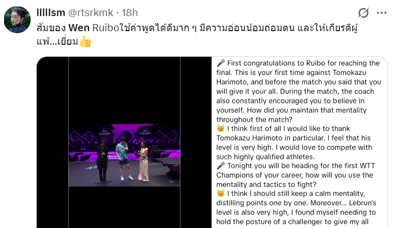 全世界的球迷都认识到了这位19岁的小将,泰国球迷:温瑞博在击败张本智和后用词很有感情,他温和谦逊,他给了失败者最高的敬意。