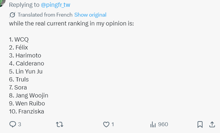一位英国球迷心目中的现役前十,王楚钦第一,小勒第二,张本第三,温瑞博第九。